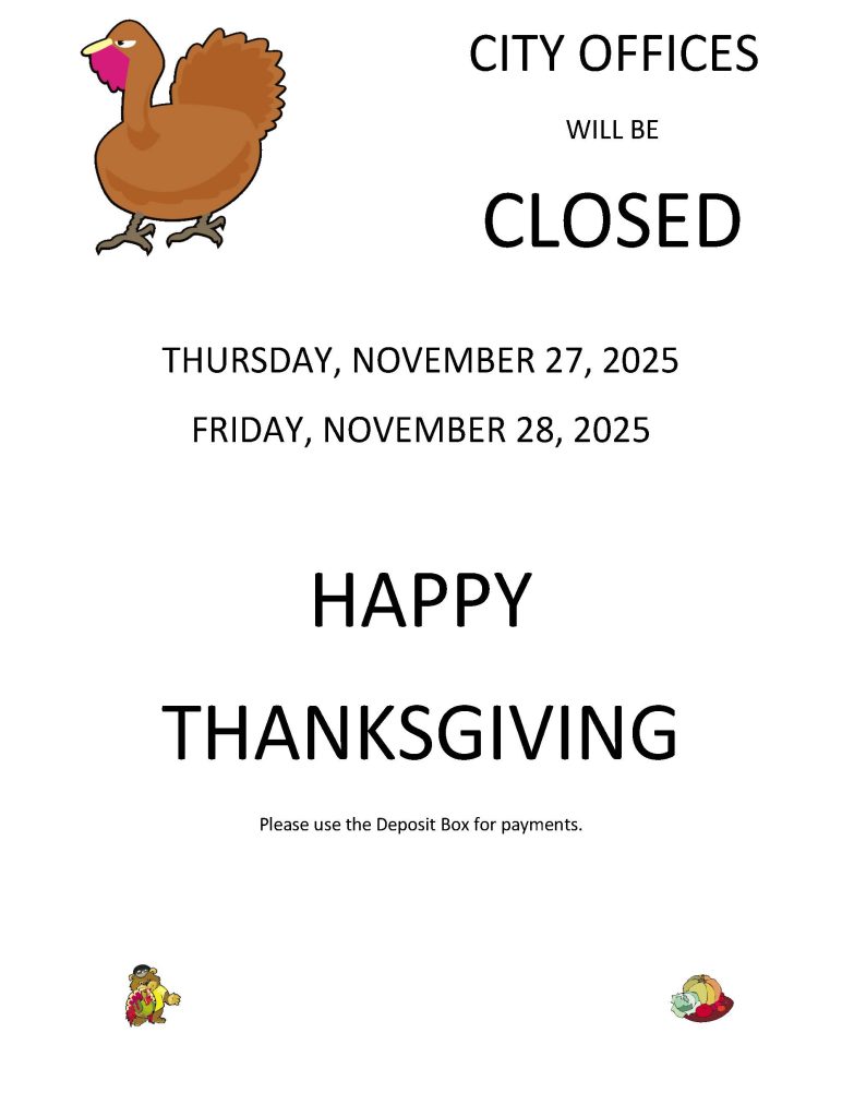 Posted on November 25, 2025 by Deb klovstad City Hall will be Closed Thursday November 27 and Friday November 28, 2025. Hope you all have a wonderful Thanksgiving and happy shopping.
